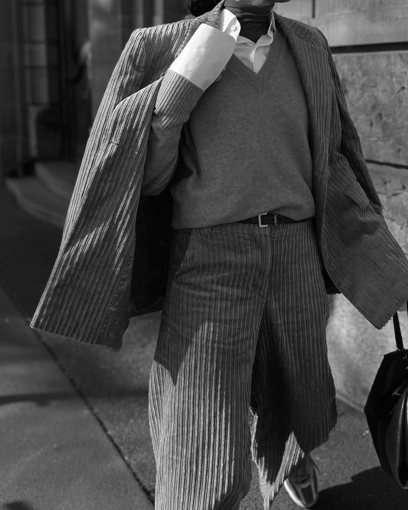 Styling Tip: Add metallic accessories or a pop of color with your shoes or bag to break up the monochrome palette.