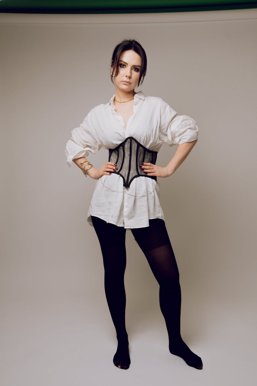 Layering a corset top over a white shirt adds a fashionable twist to your outfit. This combination creates a unique silhouette and showcases your style prowess.